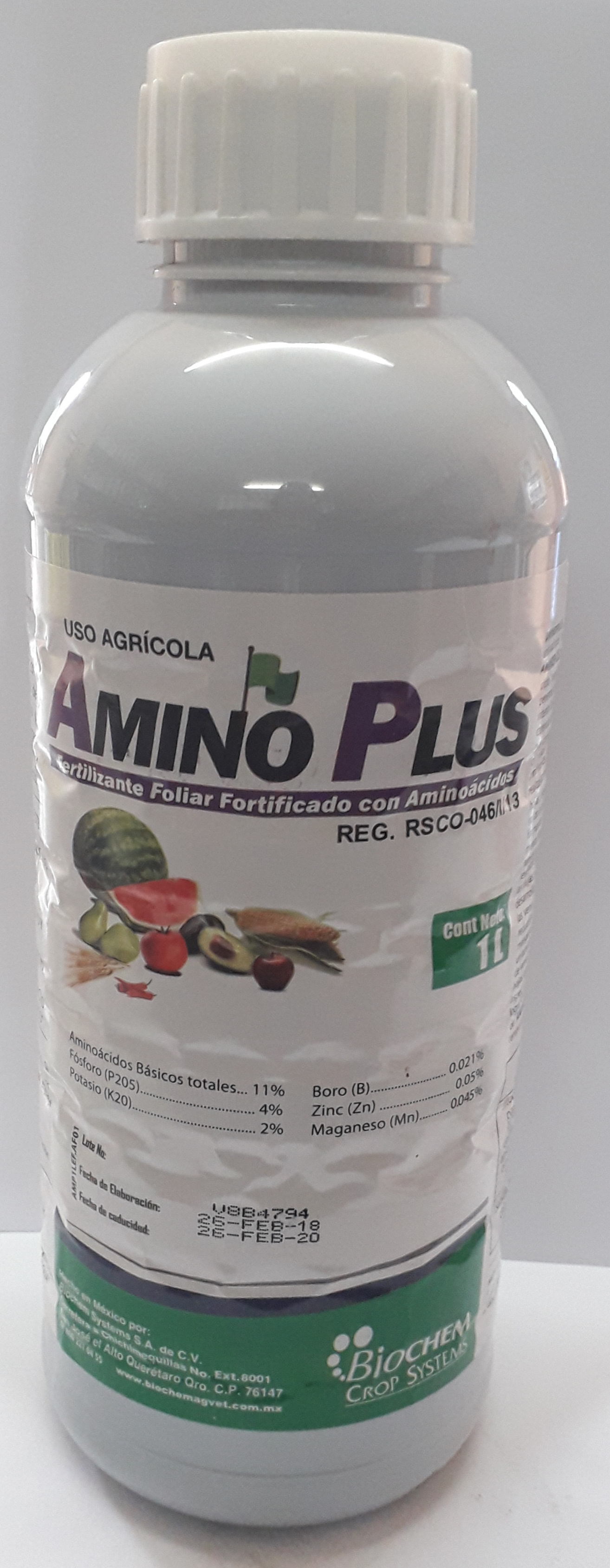 Es un fertilizante formulado especialmente para complementar los requerimientos nutricionales de todo tipo de cultivos, ideal en gramincas. Participa en diversos procesos de importancia durante el desarrollo vegetal, como la formación del tejido vascular; desarrollo de hojas y tallos; tolerancia al acame; llenado de grano, espiga y panoja; desarrollo de las mazorcas y tolerancia al estrés. Amino Plus esta formulado con los aminoácidos esenciales de las plantas, proteínas bioasimilables las funciones fisiológicas y bioquímicas.